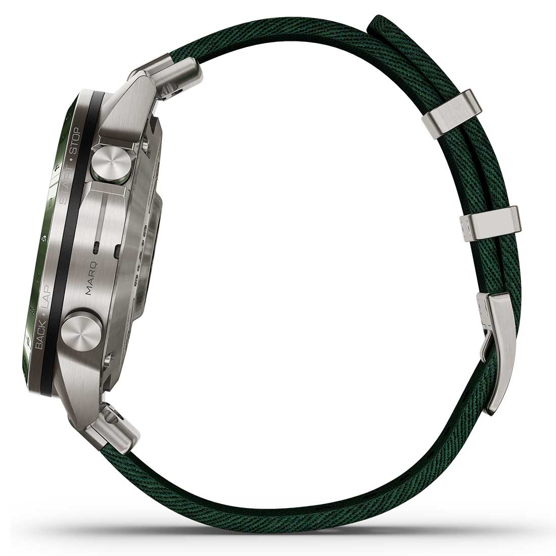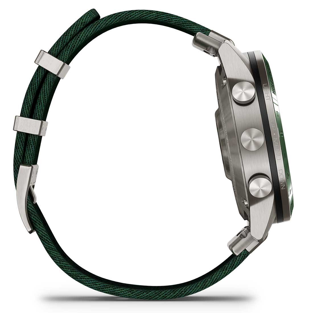 Features a tritone green jacquard-weave nylon strap and a sleek, durable design.