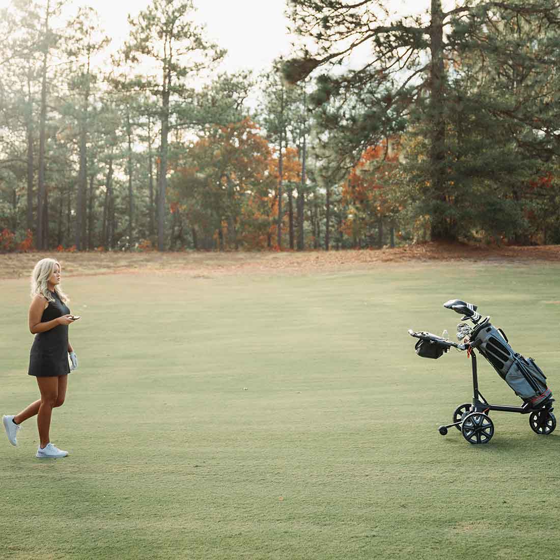 This high-powered cart fully charges in just four hours and can be wirelessly engaged using an ergonomic remote control to allow for effortless maneuverability on the course. At a lightweight 28.6 pounds, this compact electric cart is easy to transport and features a convenient two-step fold for simplified storage. With seven adjustable speeds, large all-terrain wheels and a long-lasting lithium-ion battery, the Volt easily navigates any type of terrain for up to 36 holes.