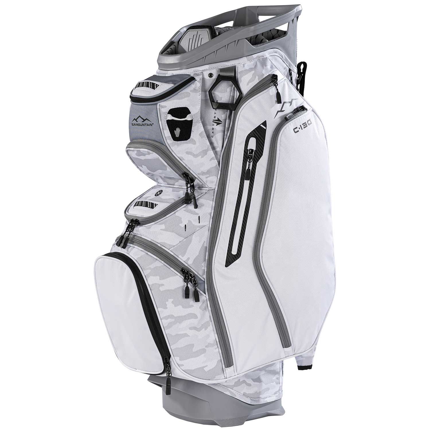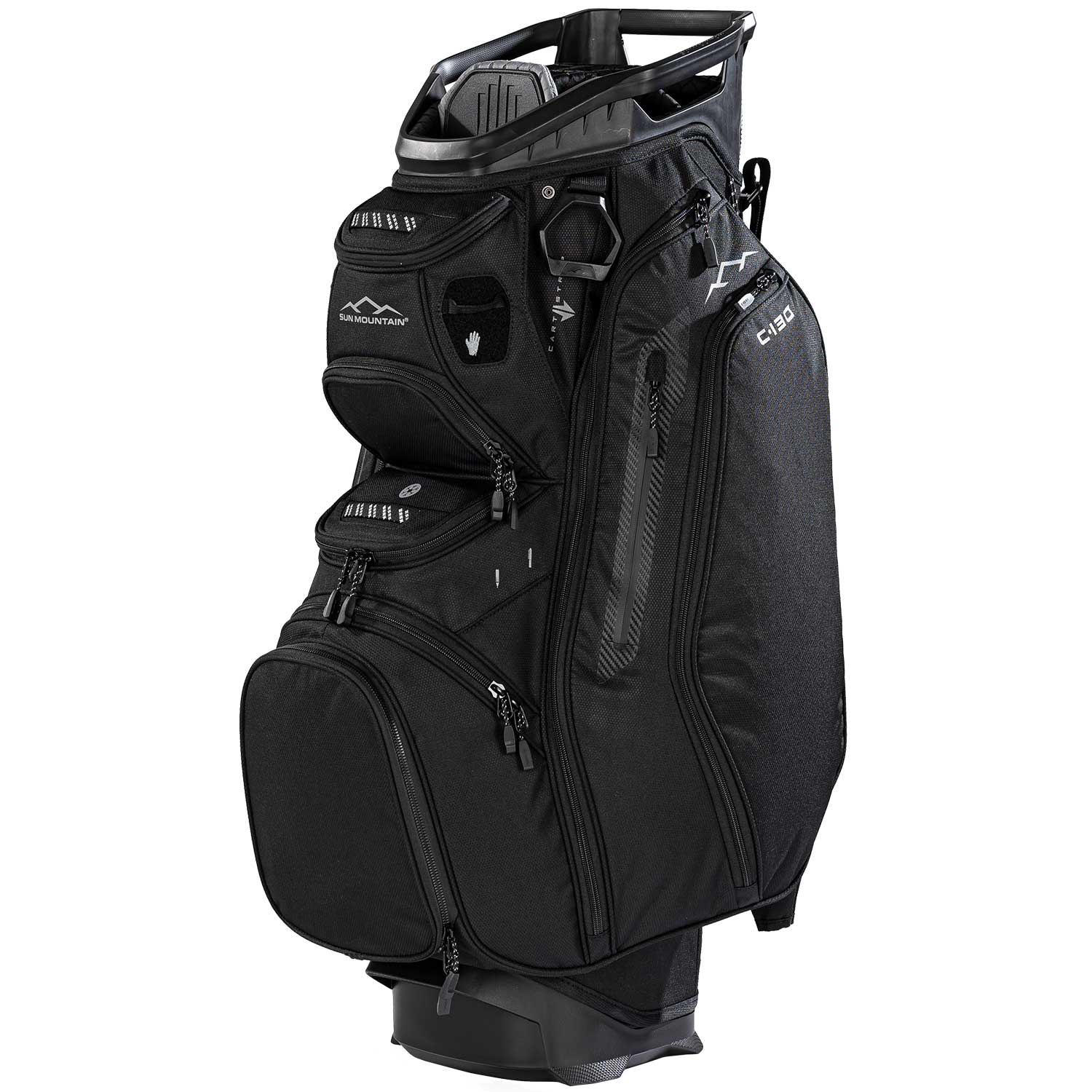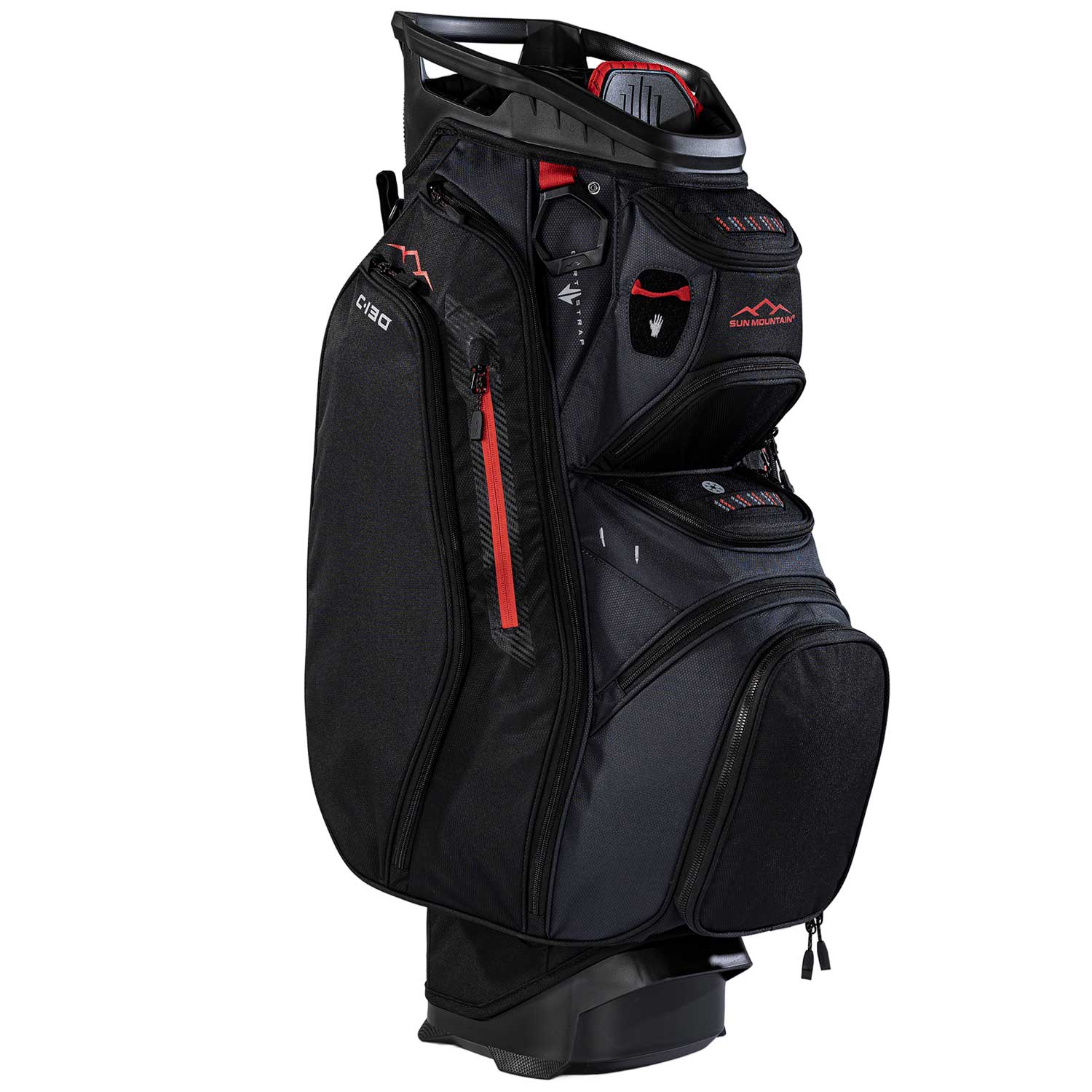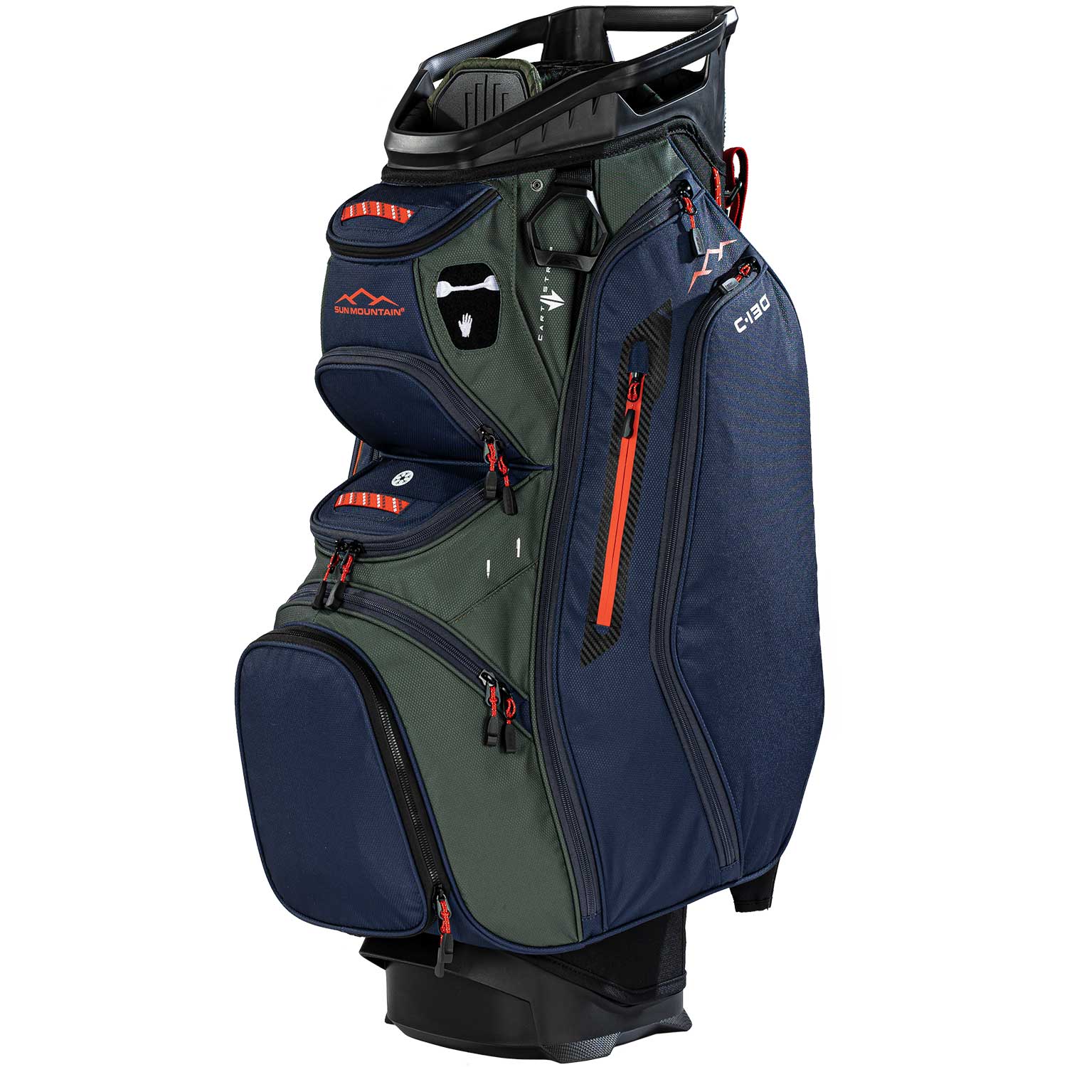 The Sun Mountain C-130 Cart Bag features a 14-way top, 11 pockets, Smart Strap System, and cart-ready design built for organization and convenience.