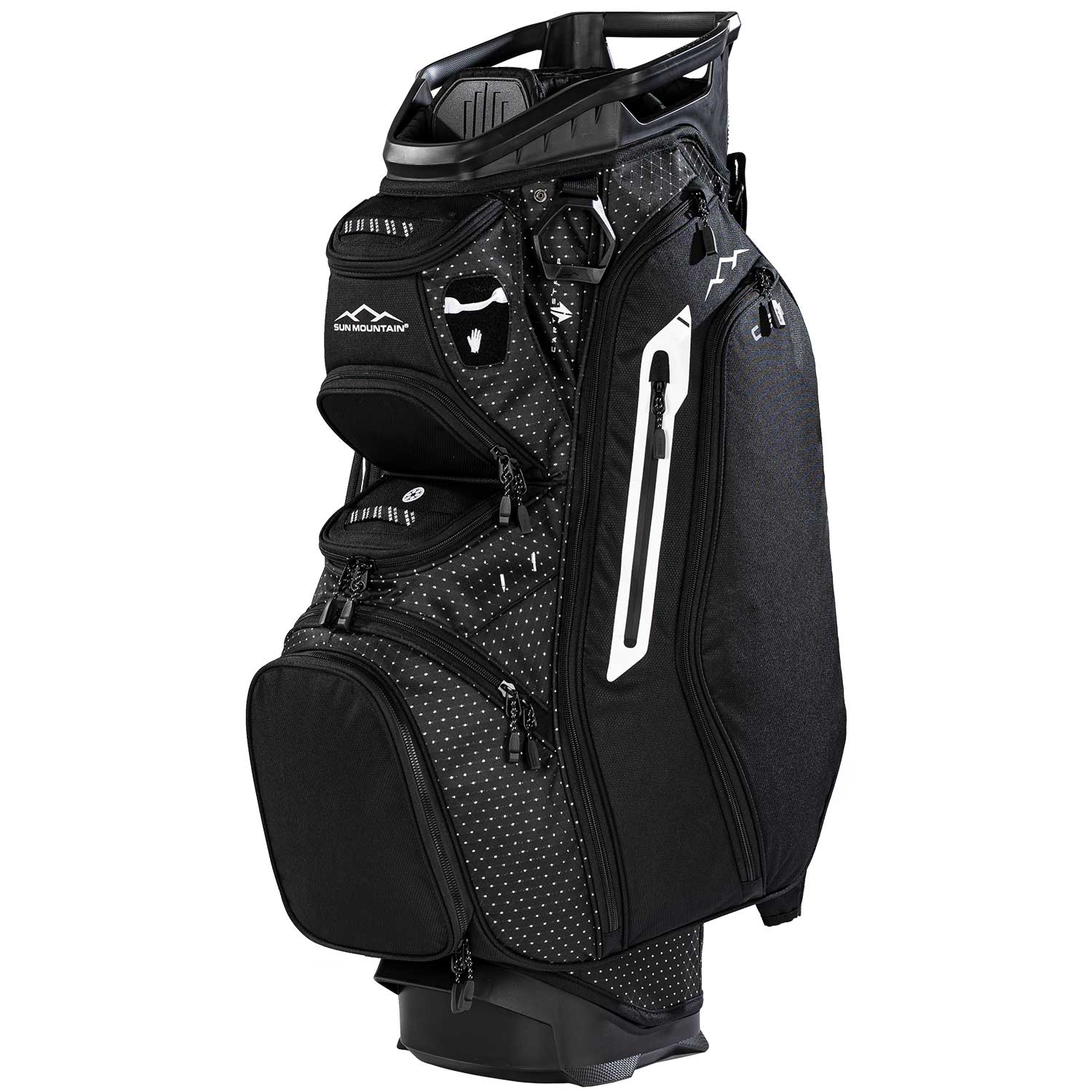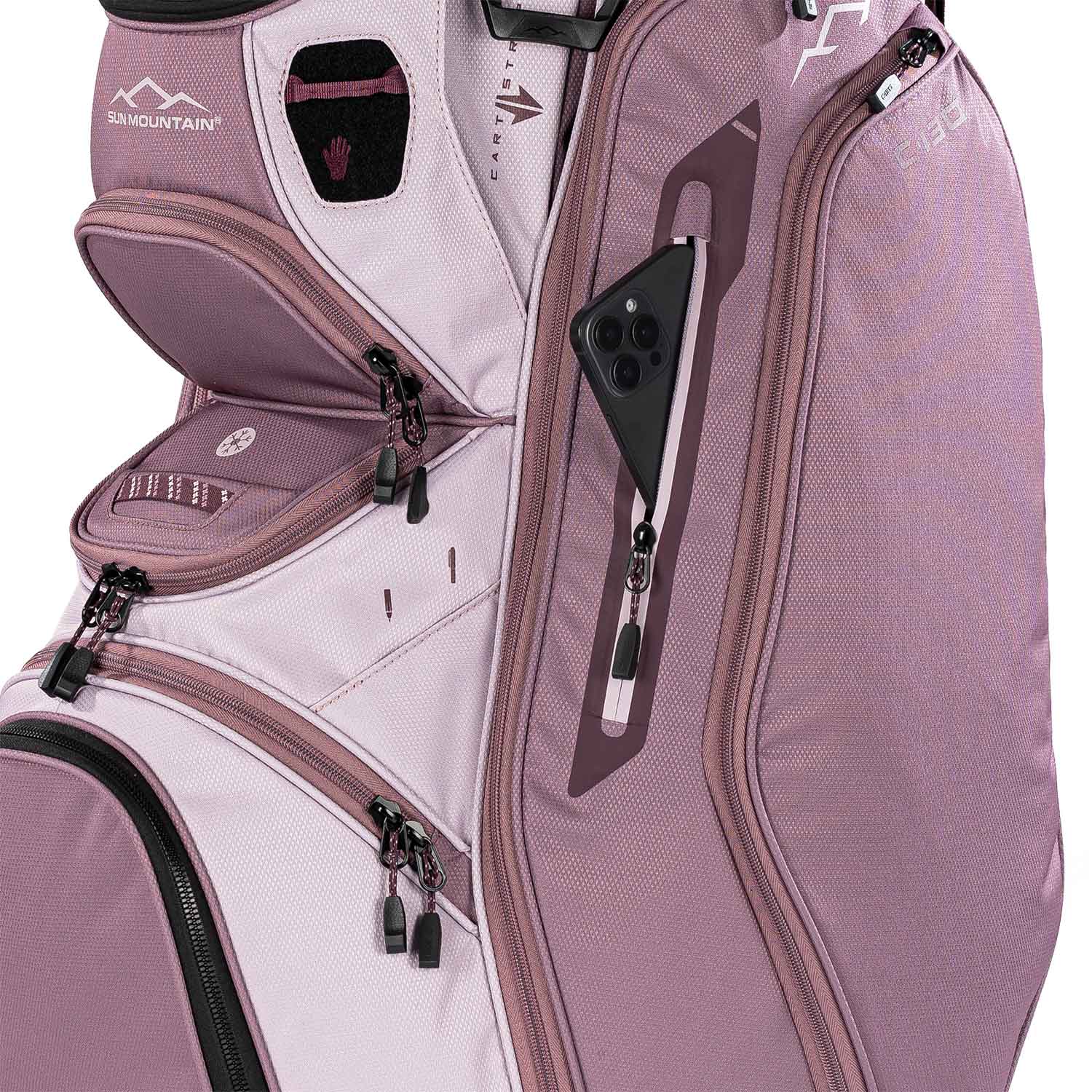 The Sun Mountain C-130 Cart Bag features a 14-way top, 11 pockets, Smart Strap System, and cart-ready design built for organization and convenience.